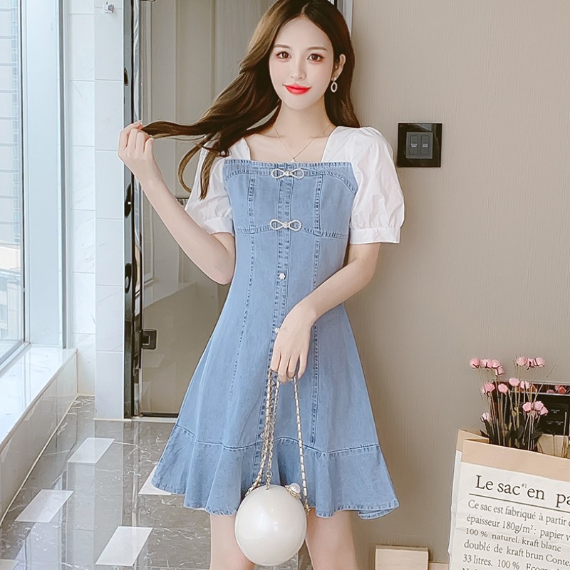 夏季2021年新款牛仔連衣裙法式長款方領小眾溫柔氣質仙女裙子