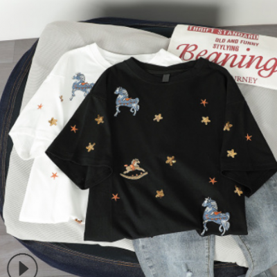 純棉短袖t恤女ins潮女裝2020夏季新款外貿跨境一件代發刺繡上衣