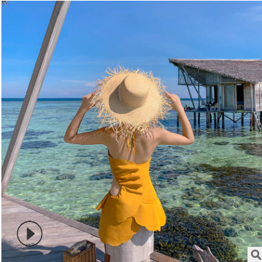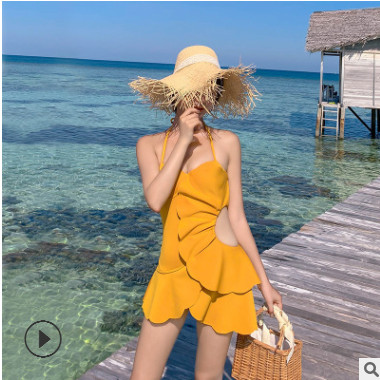 2019新款游泳衣女連體裙式網紅露背荷葉邊度假韓國泡溫泉顯瘦保守