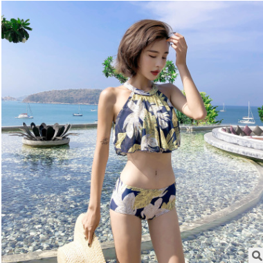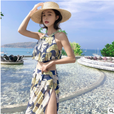 游泳衣女新款比基尼分體三件套性感度假溫泉泳衣女掛脖荷葉邊小胸