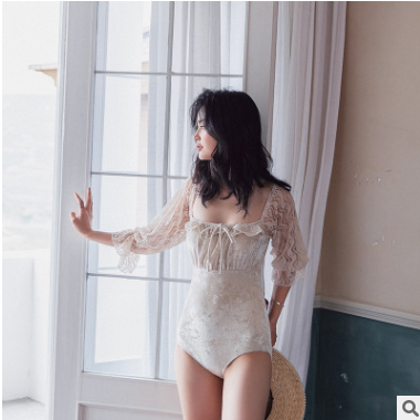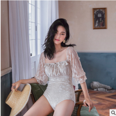 復(fù)古輕奢高貴金絲絨綁帶宮廷少女網(wǎng)紗袖綁帶褶皺保守連體泳衣女