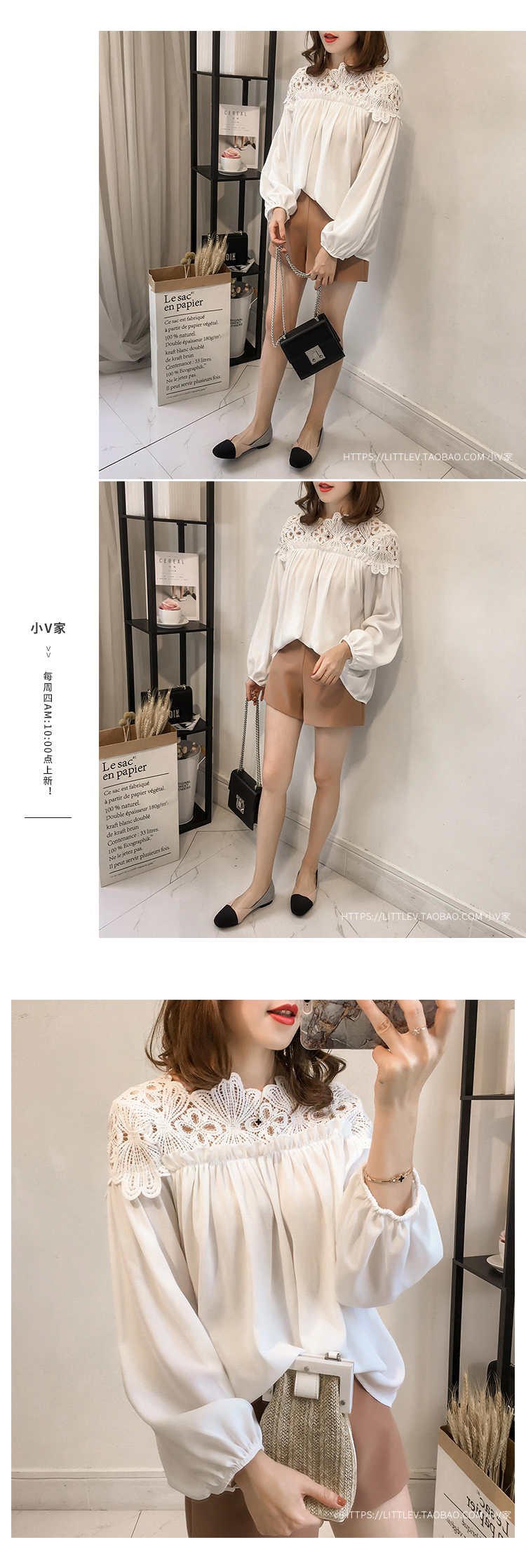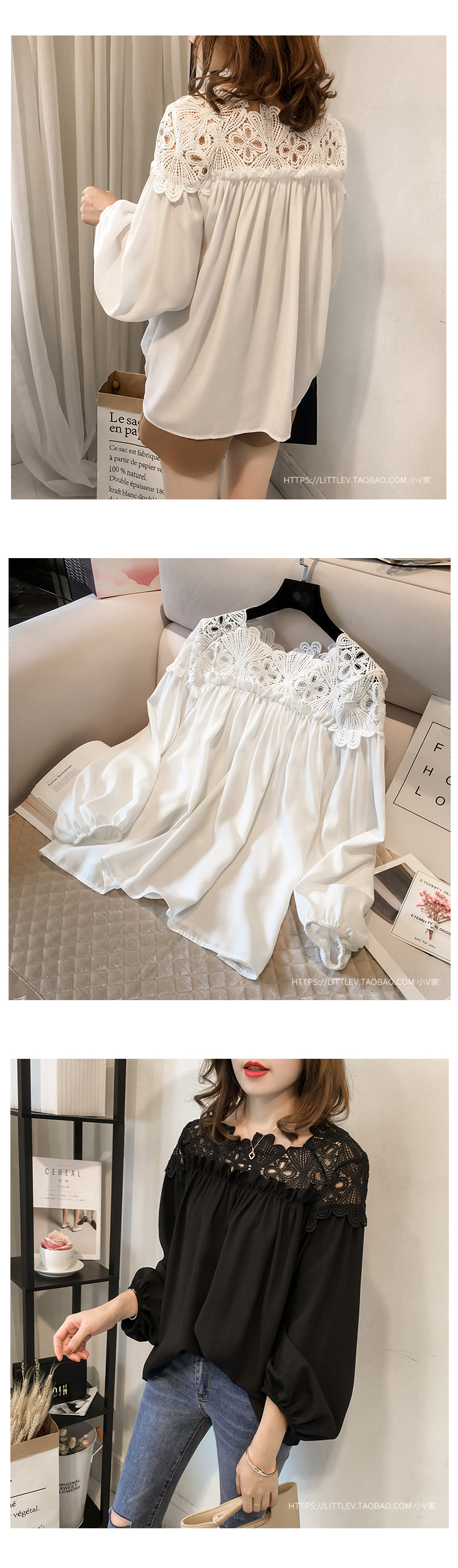 2020春秋新款韓版寬松大碼時尚鉤花鏤空蕾絲拼接雪紡衫女長袖上衣
