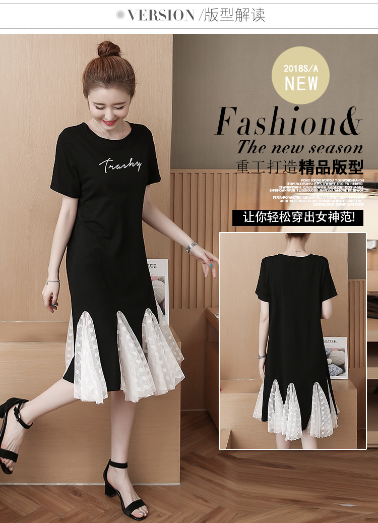 200斤大碼女裝 胖mm2018夏季寬松網紗拼接短袖連衣裙新款外貿批發