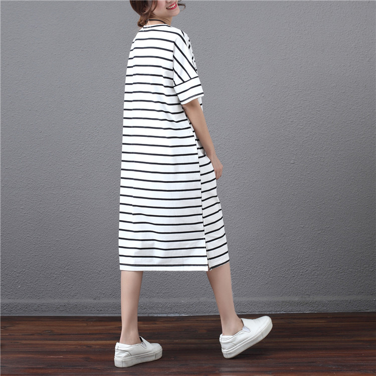 2018韓版外貿大碼女裝夏季新款胖mm寬松顯瘦條紋T恤中長款連衣裙