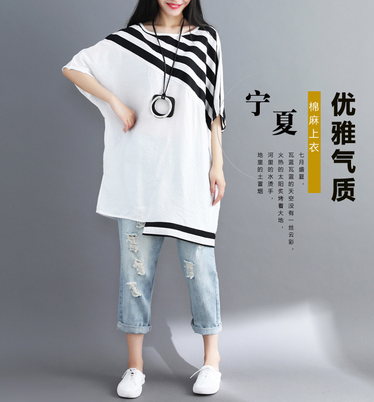 胖mm 大碼女裝2018夏季新款寬松蝙蝠衫棉麻t恤女士中長款休閑上衣