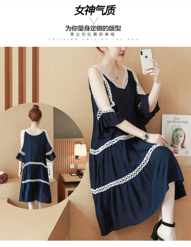 2018夏季新款韓版外貿女裝胖mm大碼寬松性感露肩拼接連衣裙孕婦裝