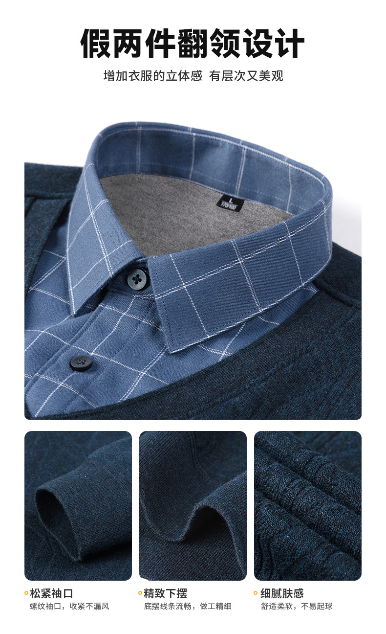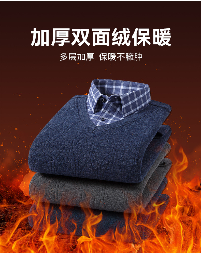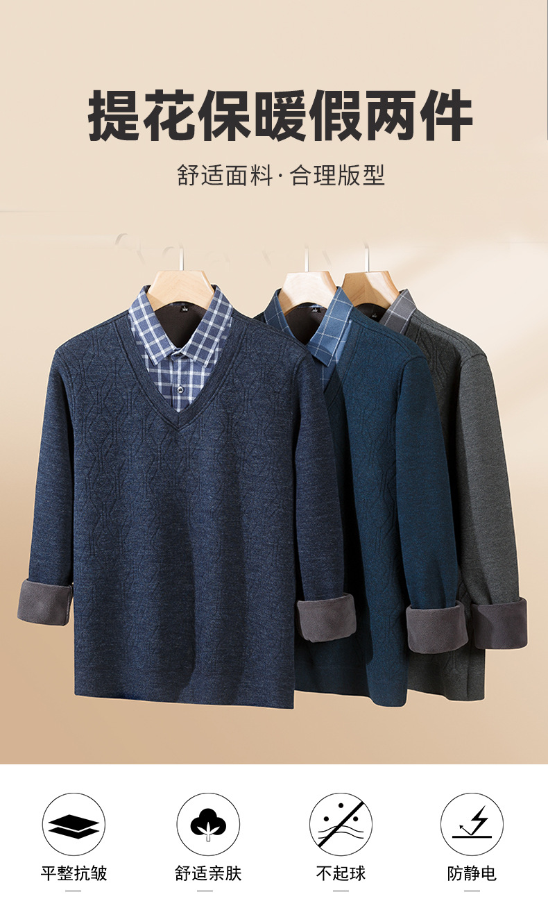 新款提花男士加絨加厚假兩件毛衣男長袖針織衫保暖襯衫男裝打底衫