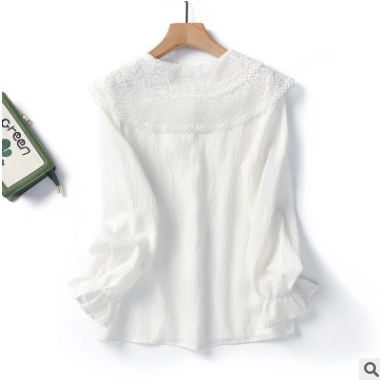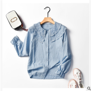 【折紙】2019秋季新款小清新襯衣娃娃領(lǐng)喇叭袖條紋襯衫女一件代發(fā)
