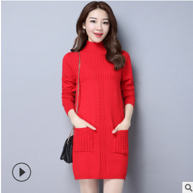中長款毛衣女套頭2019秋冬新款韓版時(shí)尚針織打底半高領(lǐng)毛衣裙子