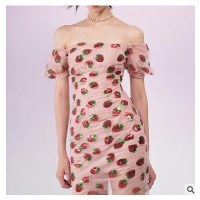 2020夏季法式抹胸法式甜美草莓亮片刺繡泡泡袖包臀連衣裙短裙9148