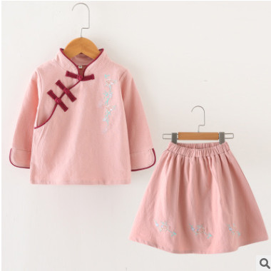 中國(guó)風(fēng)春季女童漢服棉麻兩件套民族風(fēng)寶寶兒童周歲旗袍唐裝套裝