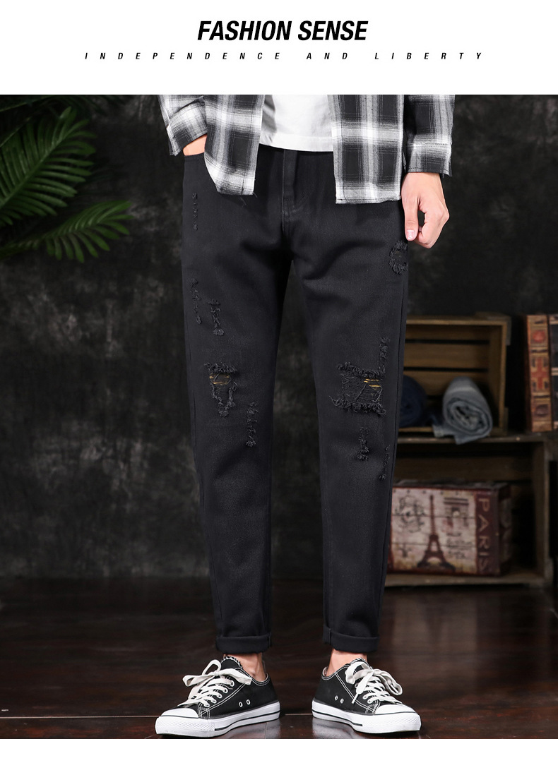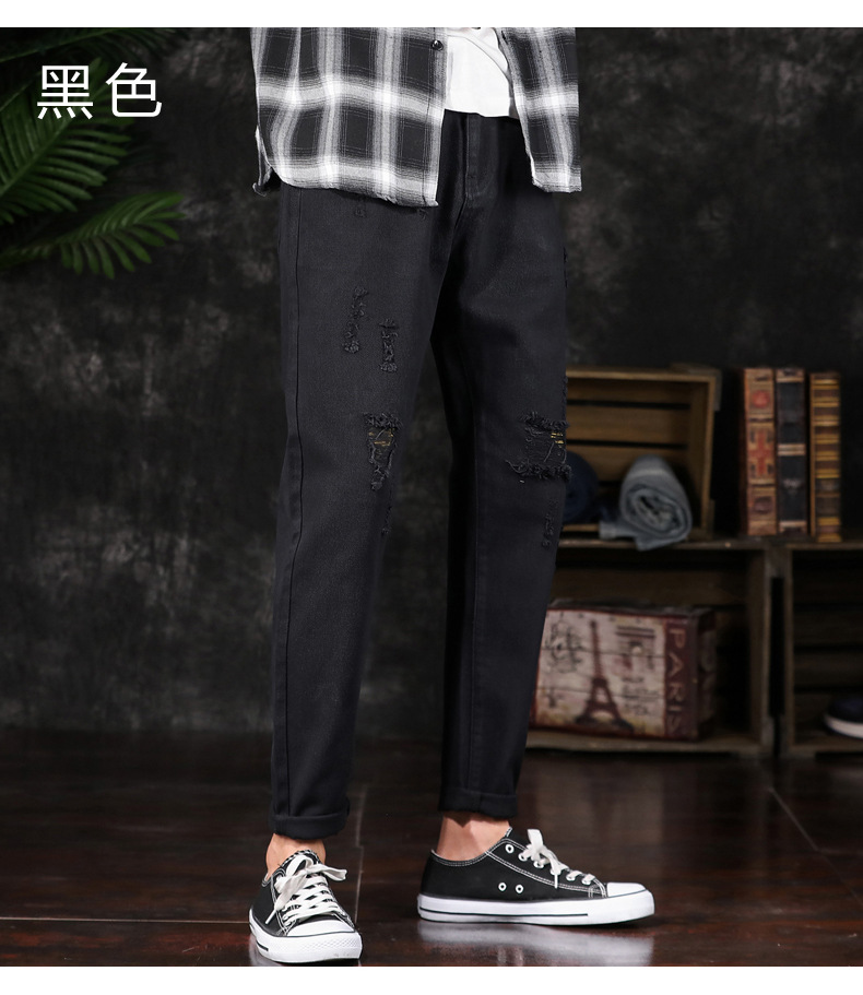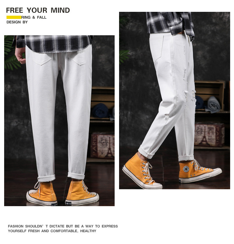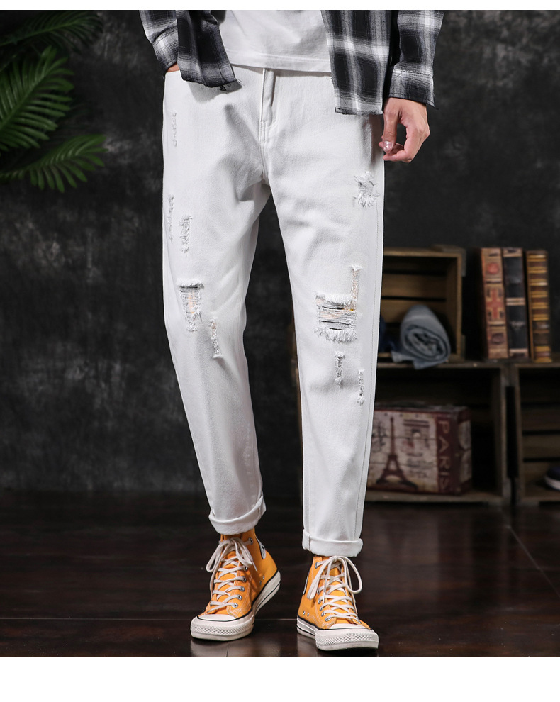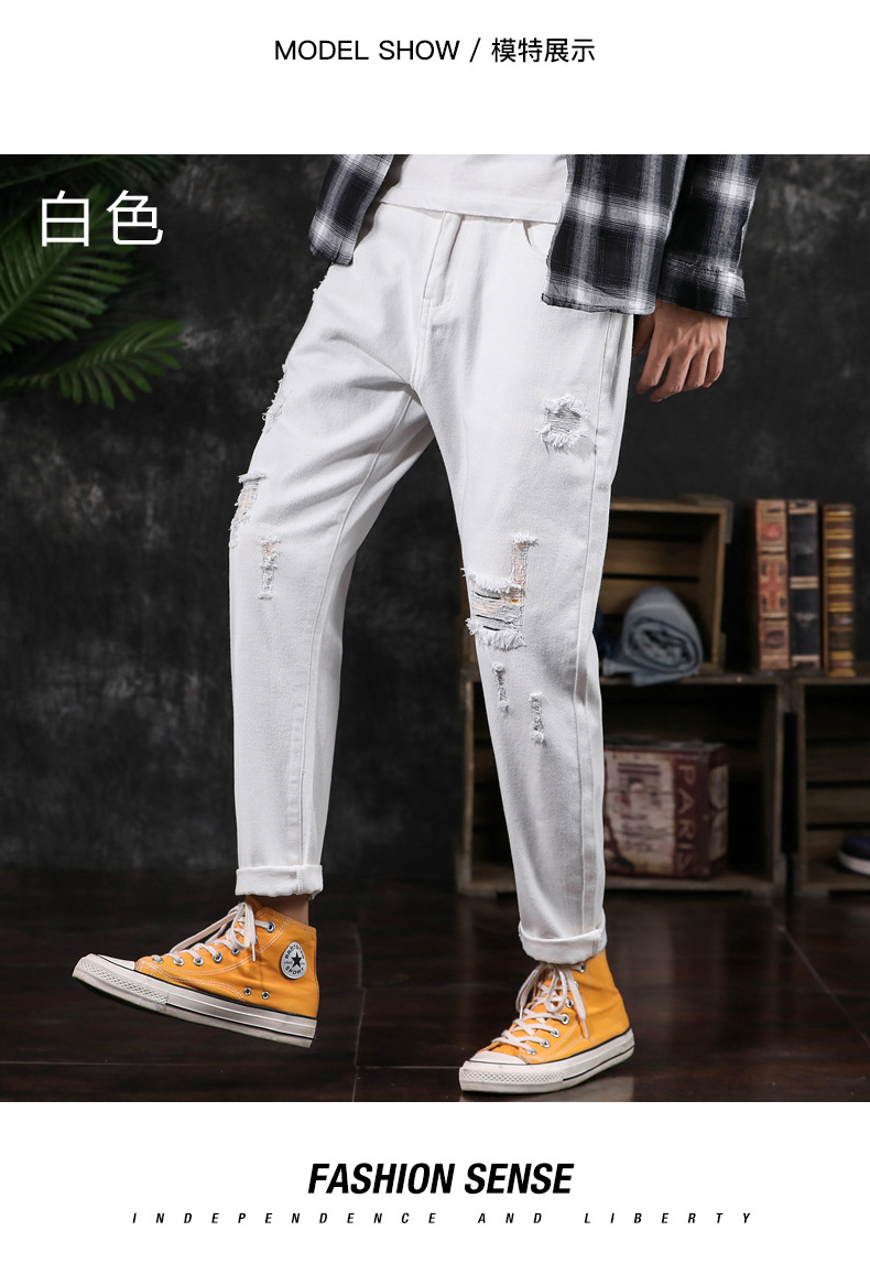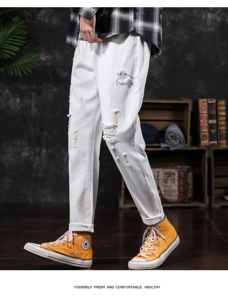 2020春夏新款哈倫褲男士白色破洞牛仔褲韓版潮流男士牛仔褲長褲子