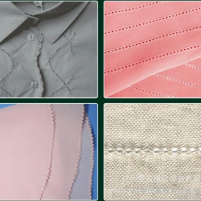 該種特殊的縫紉機只要在布料上走一行,便在布料上打出一個個有規律的小孔,這些小孔都同時被縫線固定了。更為神奇的是從這些小孔中間剪開后**變成了像郵票齒一樣美麗的邊。