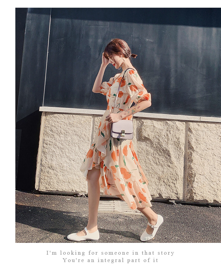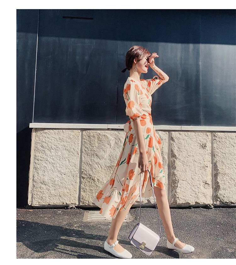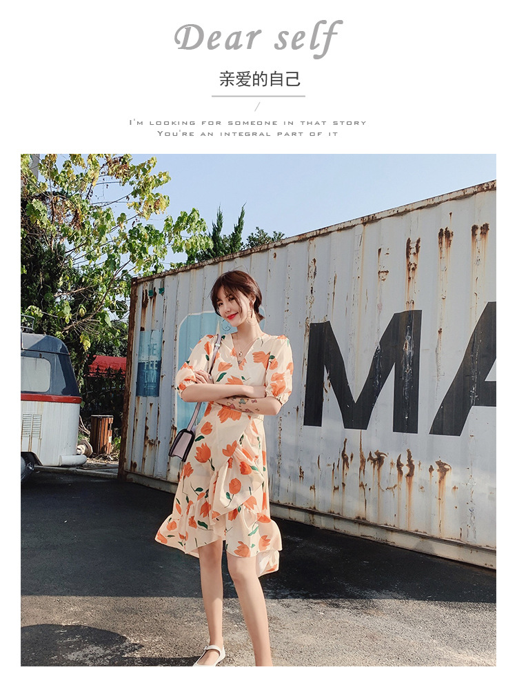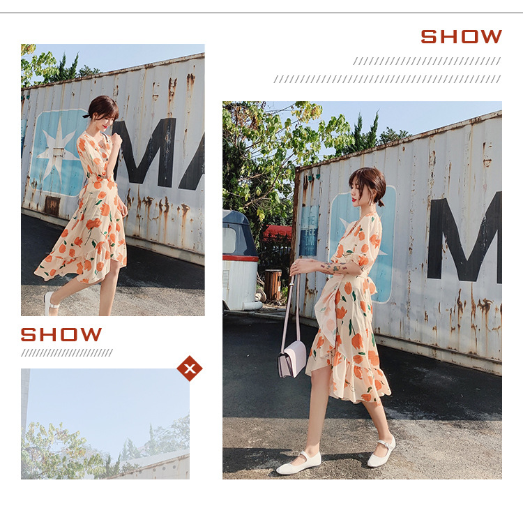 法式桔梗V領一片式裹身裙氣質顯瘦海島度假仙女裙黃色碎花連衣裙