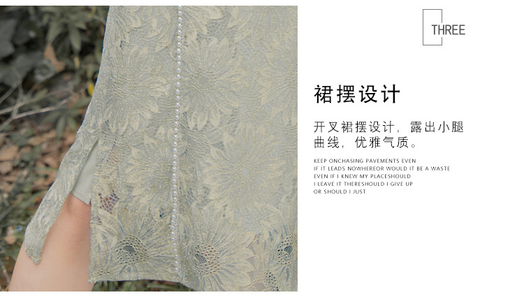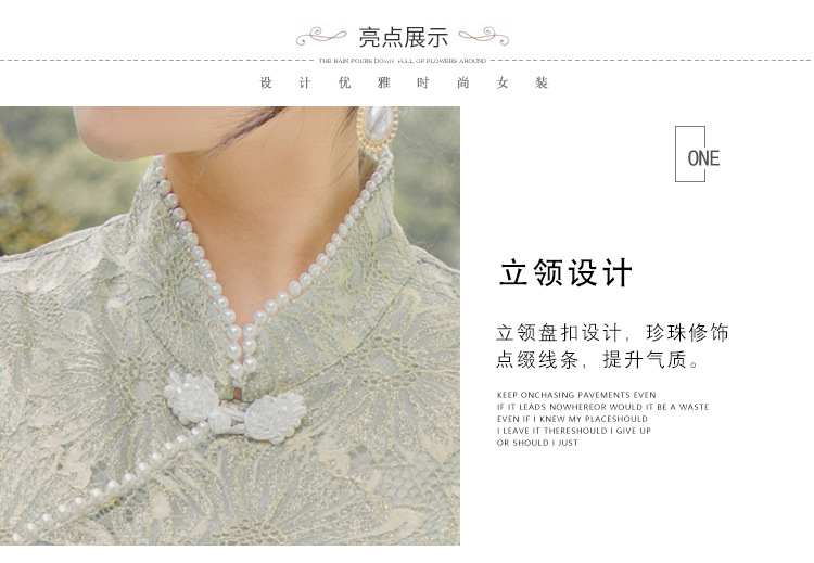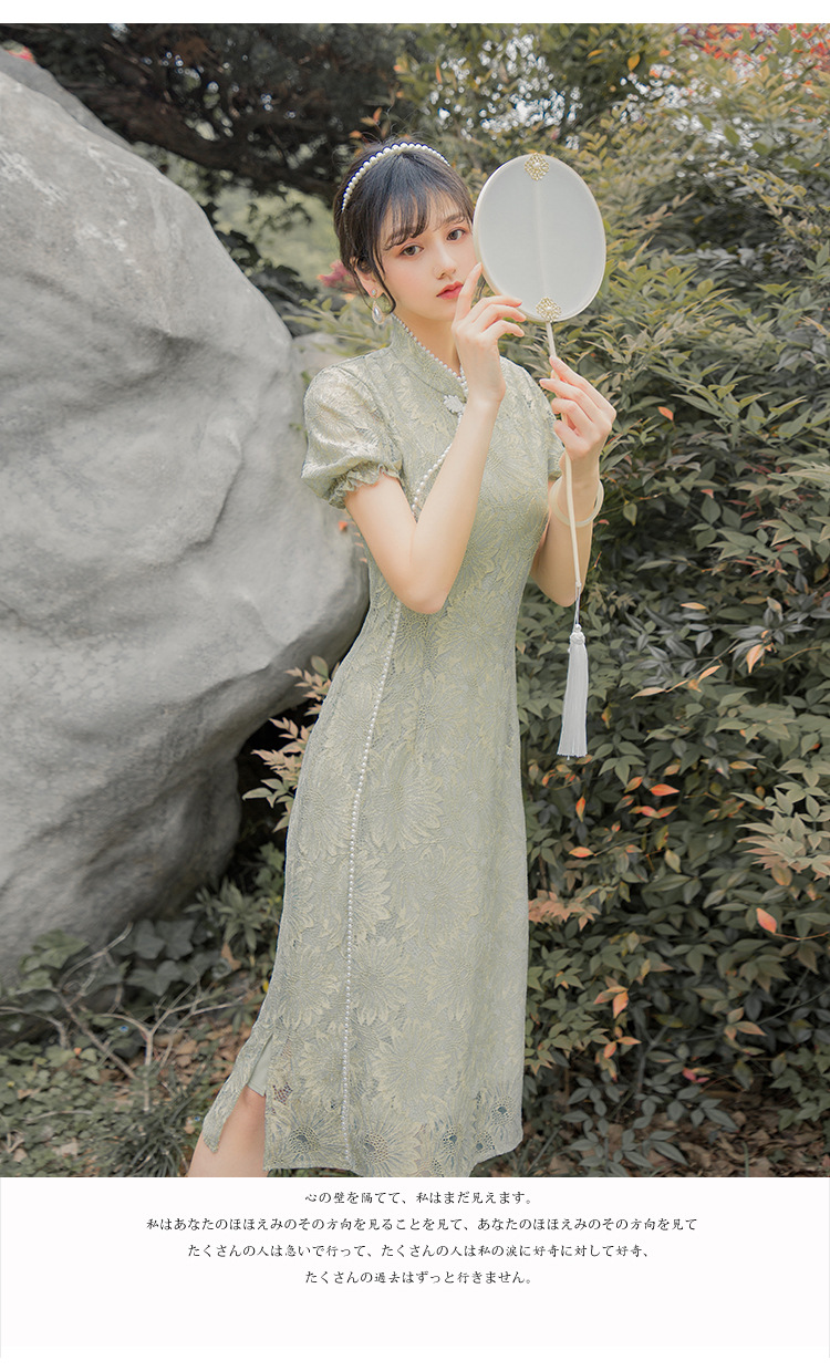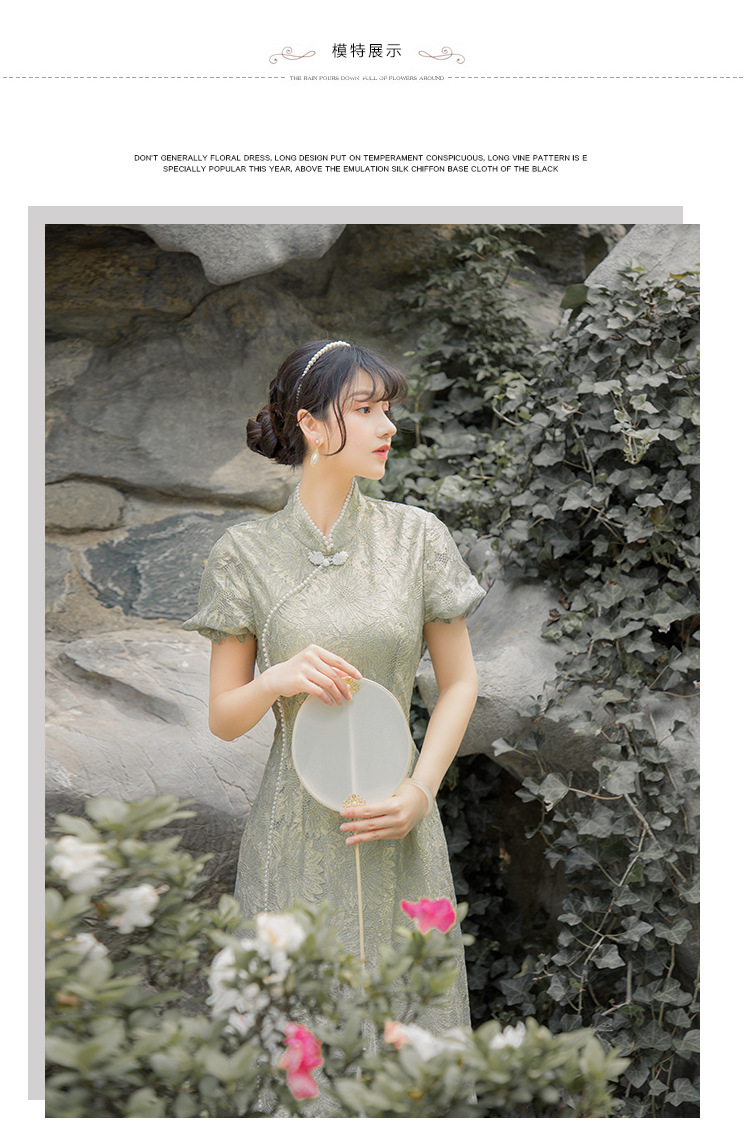 實拍珍珠鑲邊翡翠綠氣質旗袍改良版超修身連衣裙女高腰泡泡袖長裙