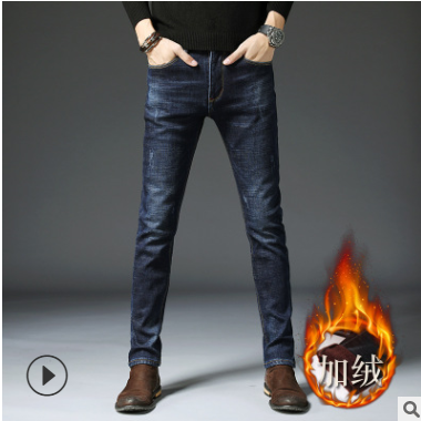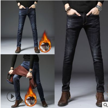 秋冬款加絨彈力男士牛仔褲男休閑修身直腳韓版潮流冬季褲子一件代