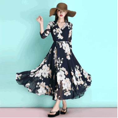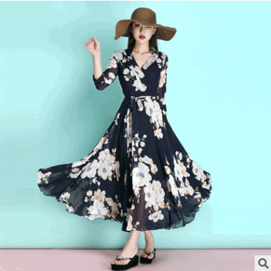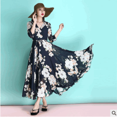 春夏新款波西米亞雪紡連衣裙印花V領寬松女式沙灘裙