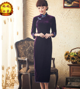 絲絨旗袍 秋季媽媽裙中式茶人服 立領(lǐng)七分袖長(zhǎng)款婚宴晚禮服