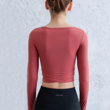 秋季新款帶胸墊長款瑜伽上衣女外穿交叉性感速干跑步運動緊身衣