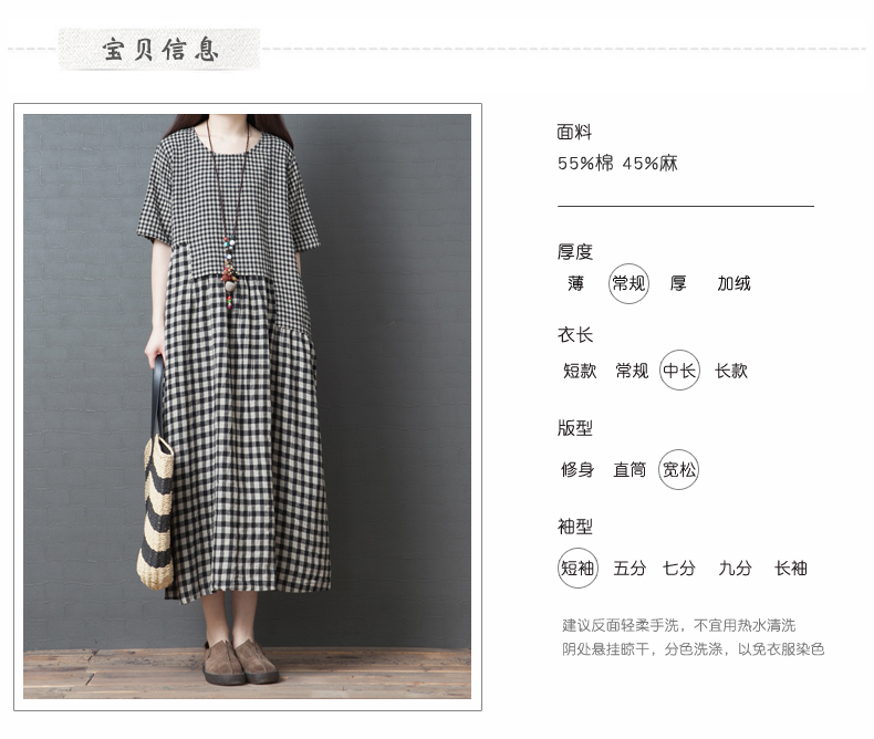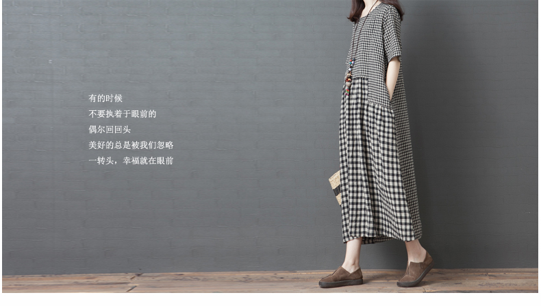 2021夏季新款韓版寬松大碼女裝時尚不規則拼接棉麻格子短袖連衣裙
