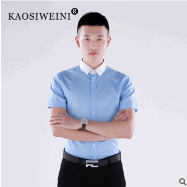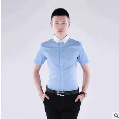 2019男式職業韓版修身新款藍色拼領工作服夏裝短袖襯衫