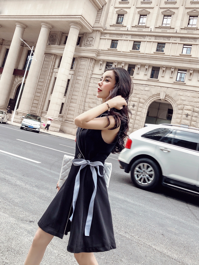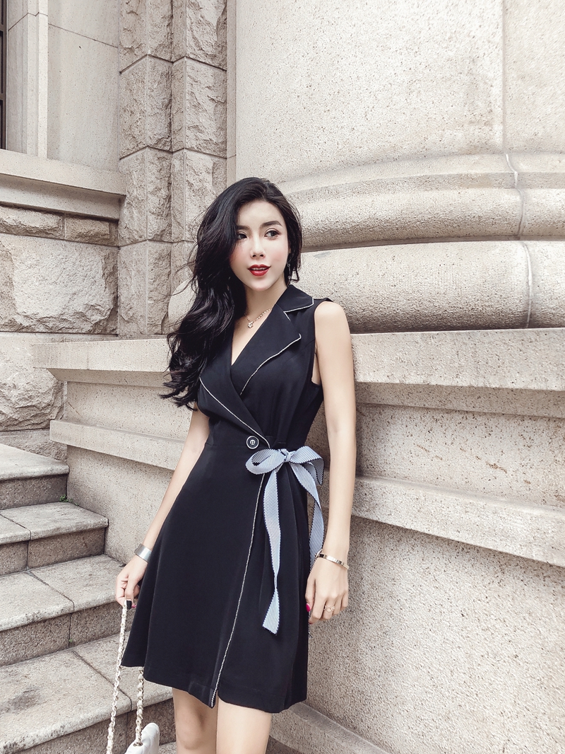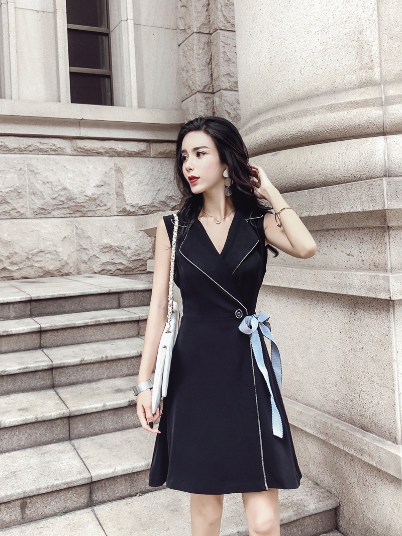 夏季新款韓版時尚西裝領(lǐng)無袖連衣裙系帶收腰a字裙一件代發(fā)