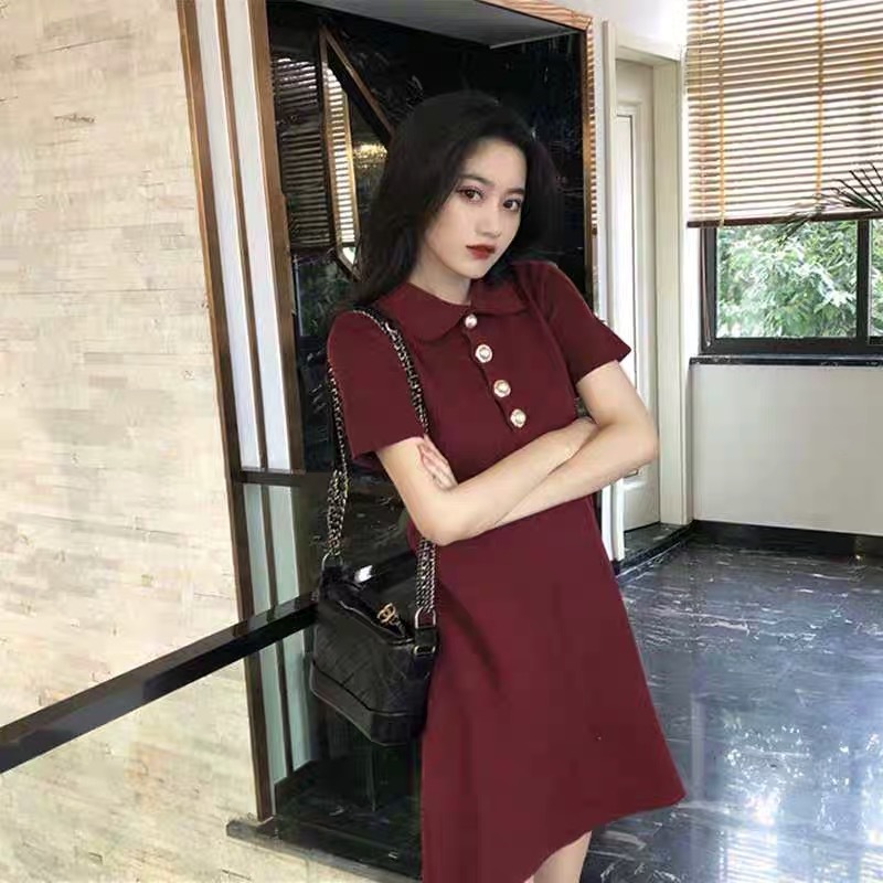 復古閨蜜短袖連衣裙中長款polo領高腰2020夏季針織收腰拼色裙子女