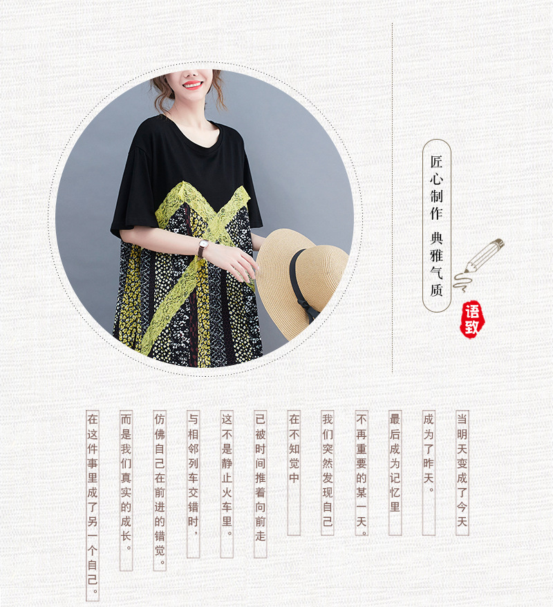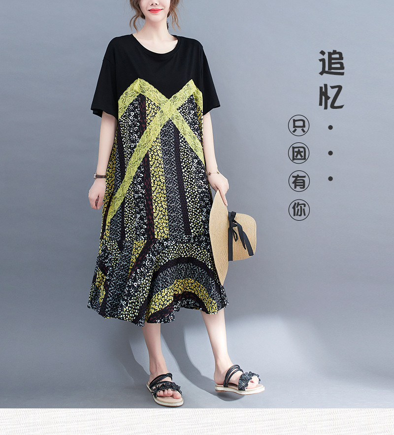 2021夏季新品大碼胖MM女裝蕾絲拼接遮肚寬松短袖顯瘦過膝連衣裙女