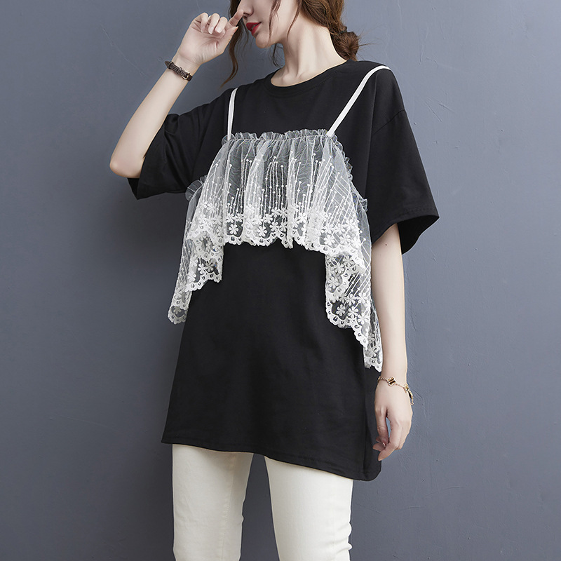 首頁 > 供應產品 > 2021年夏季新品大碼胖MM200斤女裝蕾絲拼接印花短袖遮肉顯瘦T恤女