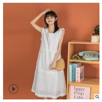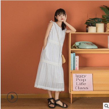 2021春夏新款小清新甜美圓領白色無袖連衣裙女中長款寬松顯瘦長裙