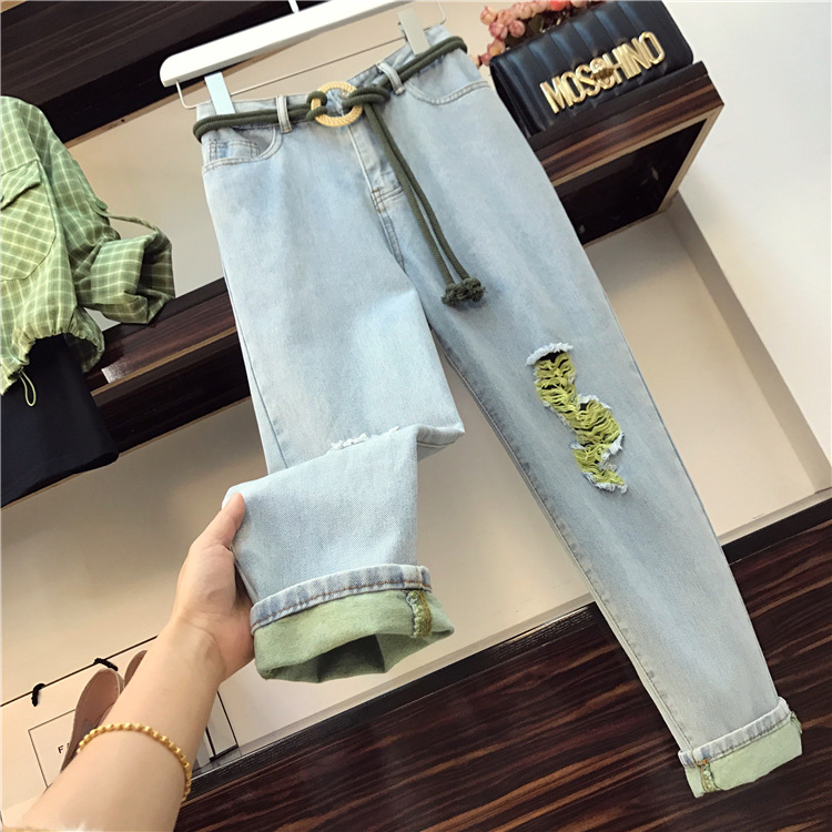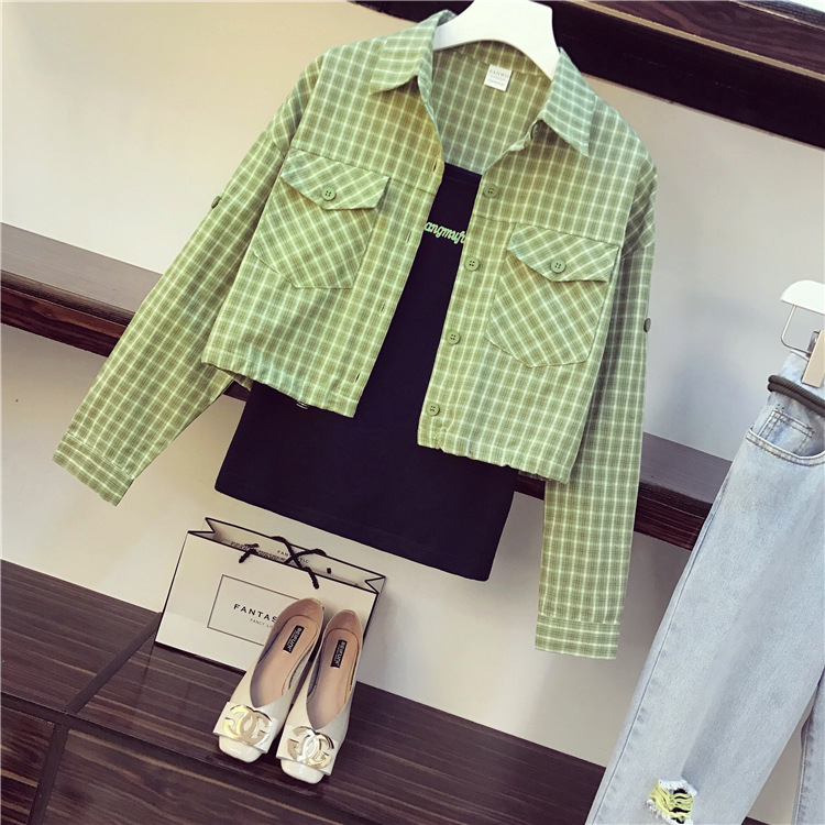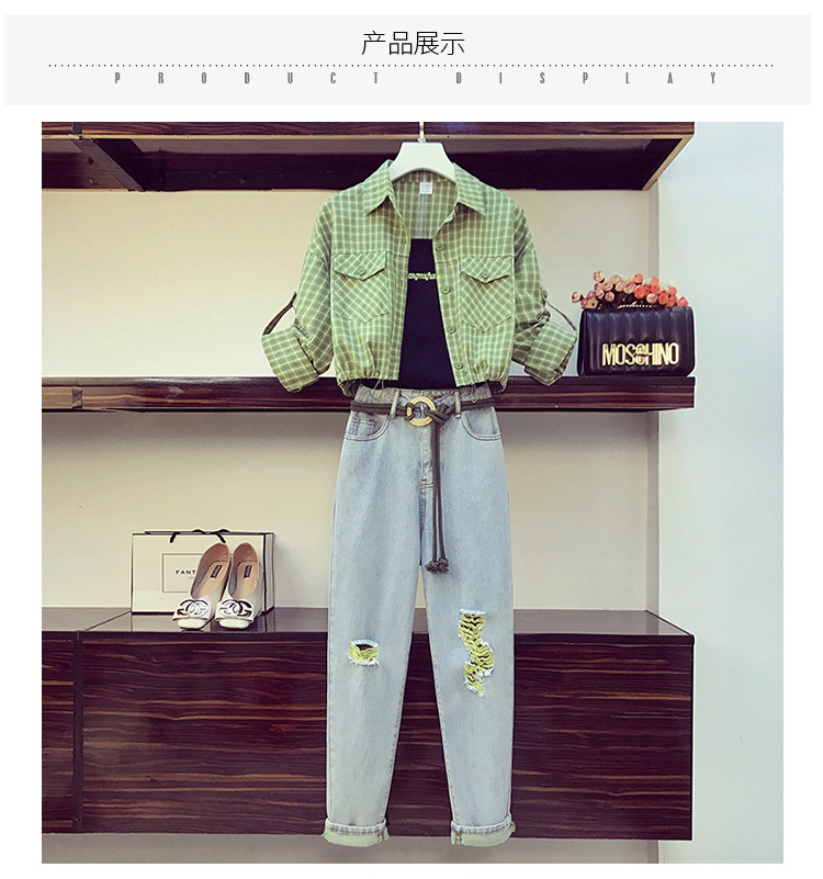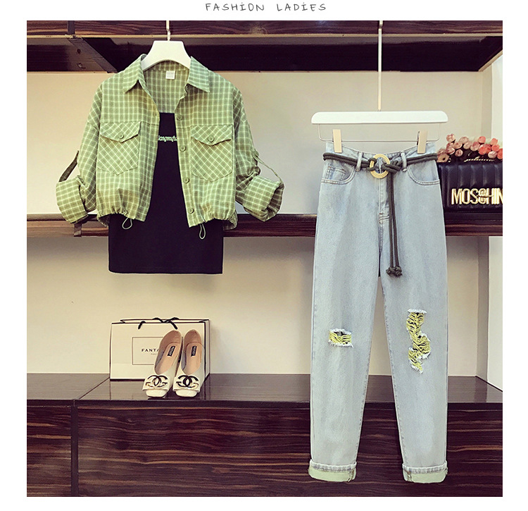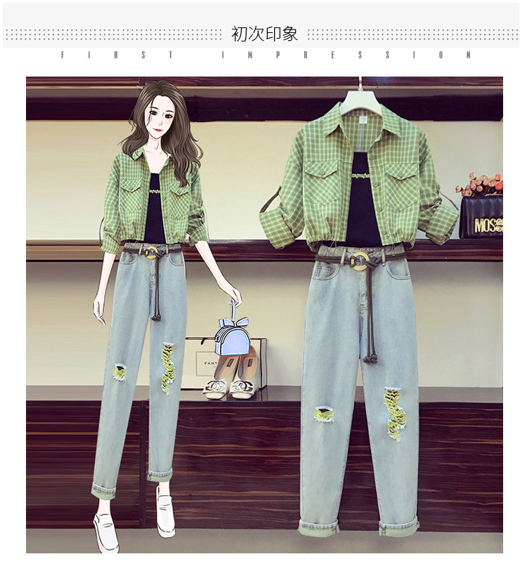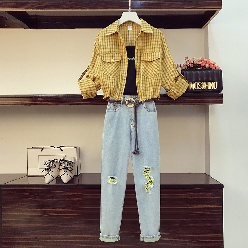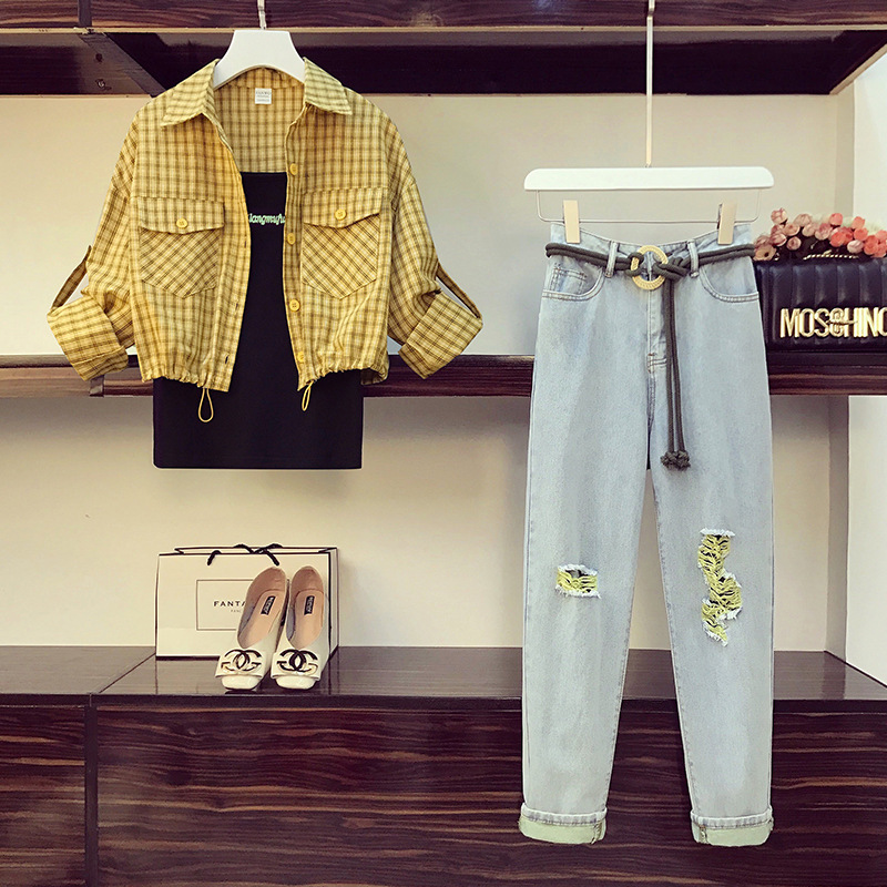 大碼女裝2021春裝新款胖MM韓版時尚格子襯衫外套牛仔褲顯瘦三件套