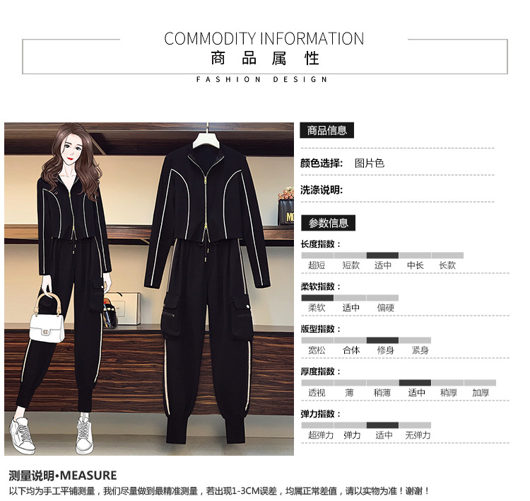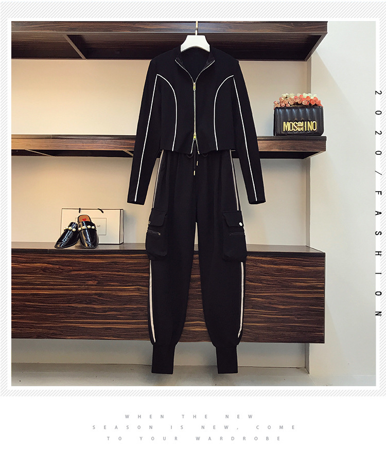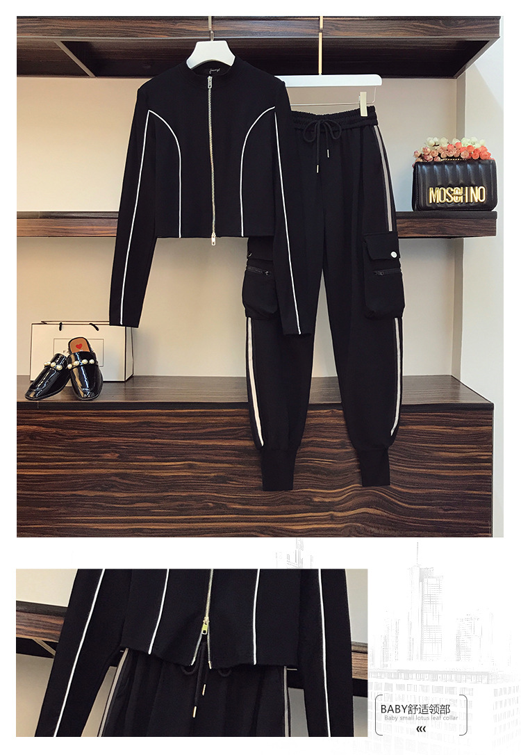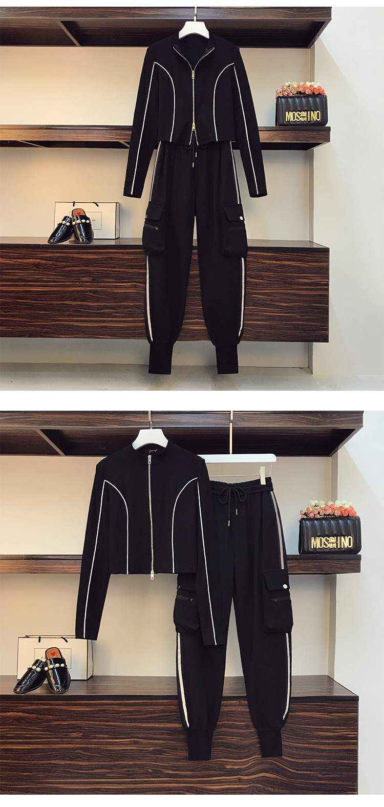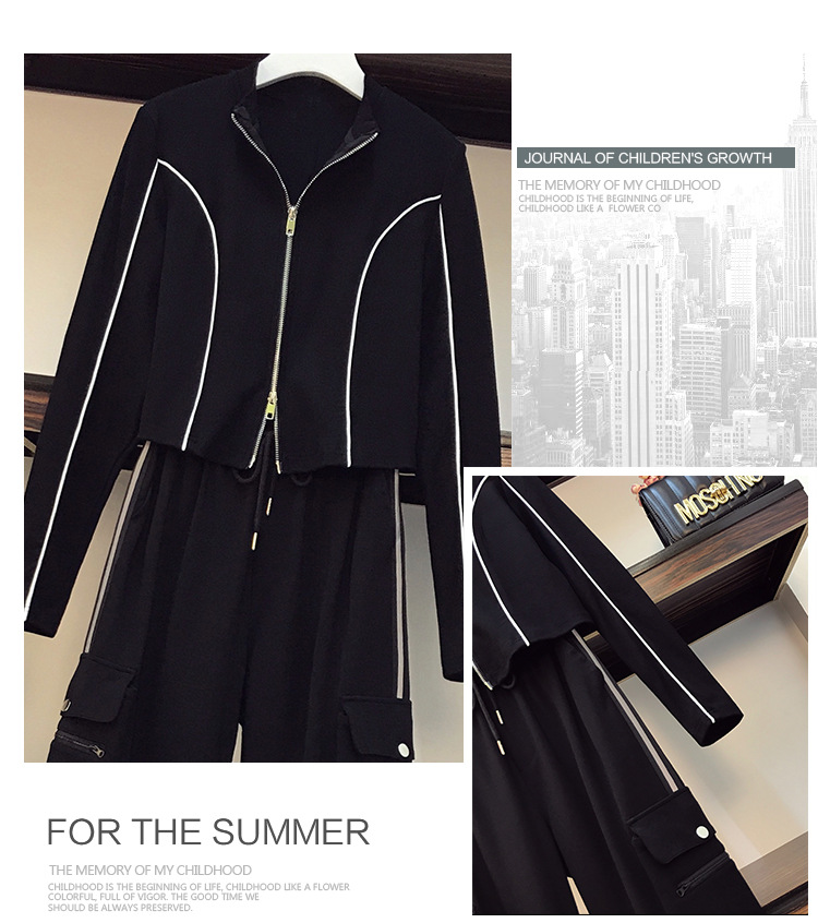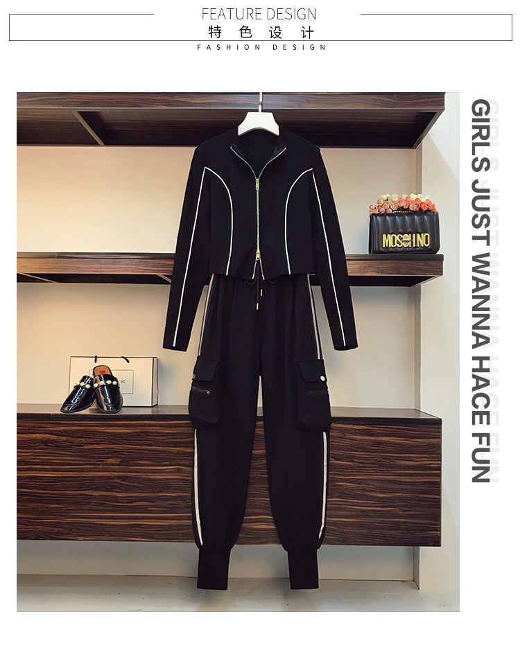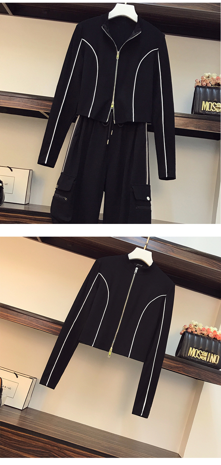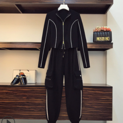 大碼女裝2021春裝新款胖mm時尚設計感減齡運動休閑開衫工裝褲套裝