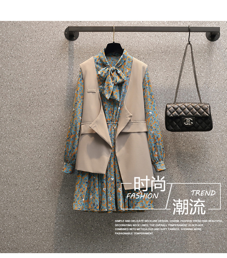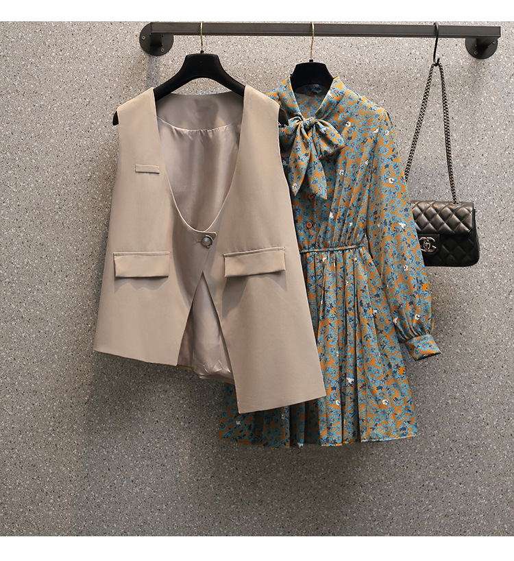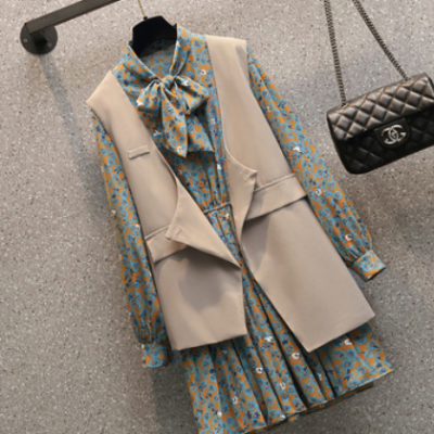 大碼女裝2021年春季新款胖MM雪紡碎花裙西裝馬甲寬松洋氣兩件套裝