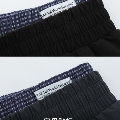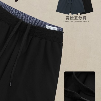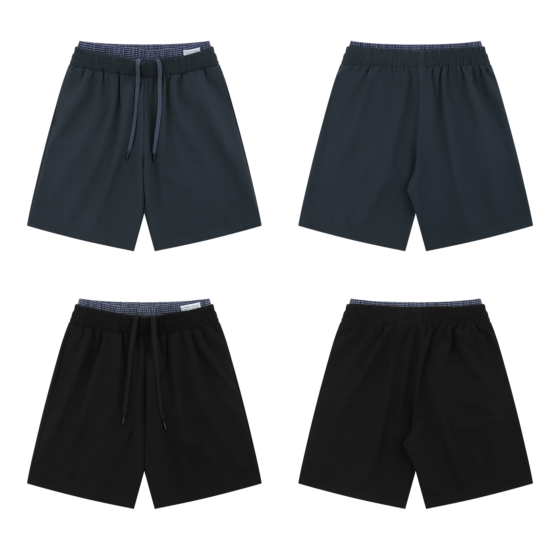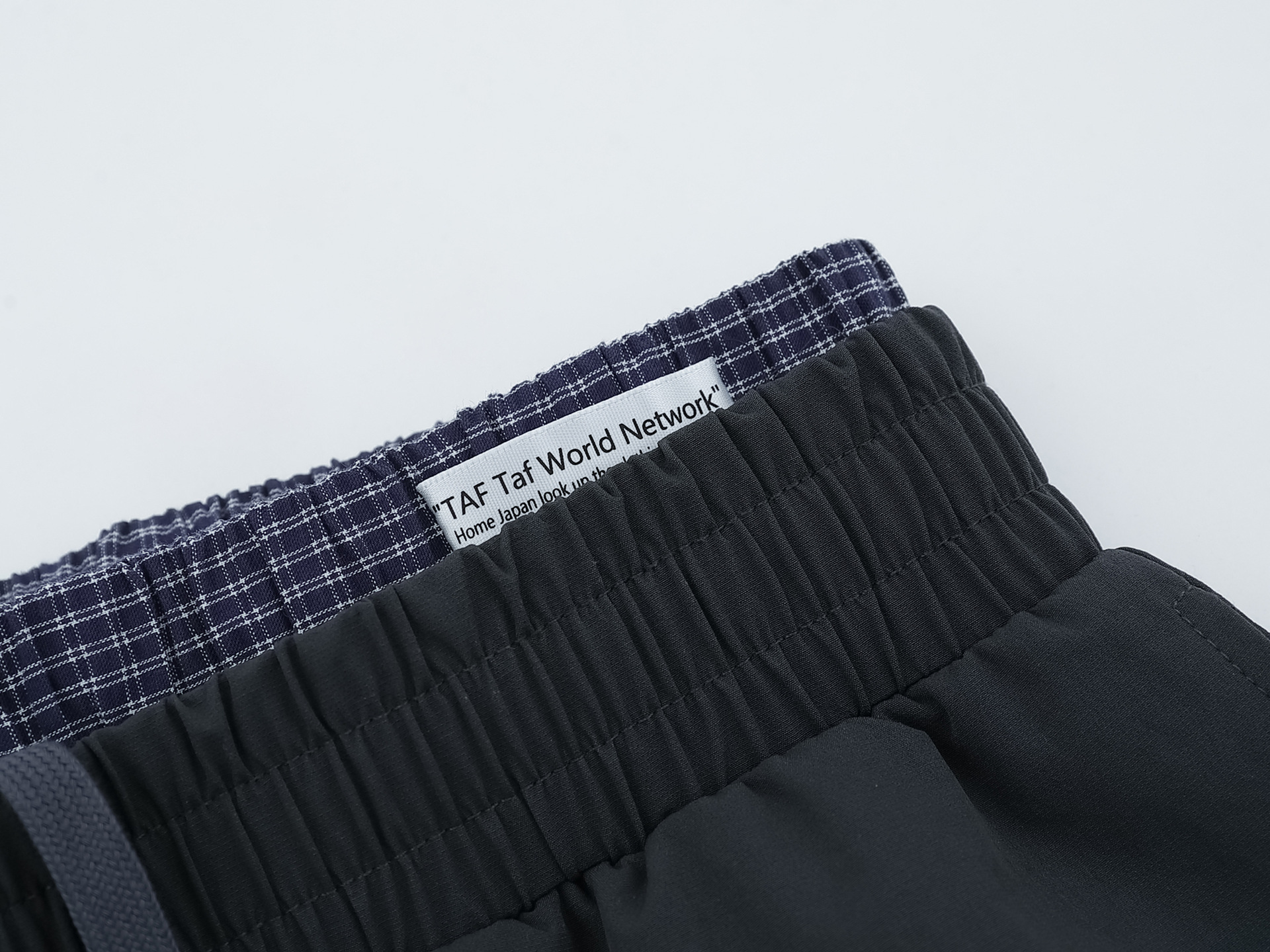 夏季薄款抽繩松緊腰頭格紋撞色高腰拼接假兩件休閑寬松五分褲男士