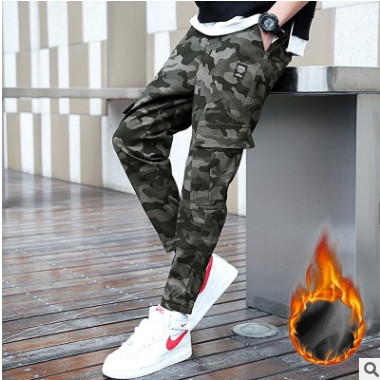 加絨工裝褲男韓版潮流秋冬時尚迷彩運動休閑褲九分褲保暖褲子男裝