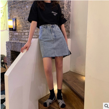 夏季韓版修身顯瘦高腰兩粒扣牛仔半身裙女一步裙a字裙子一件代發