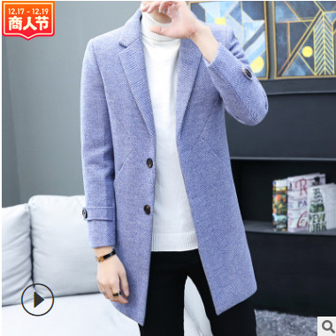 毛呢大衣男2019冬季新款士青年中長款修身純色韓版翻領休閑外套潮
