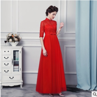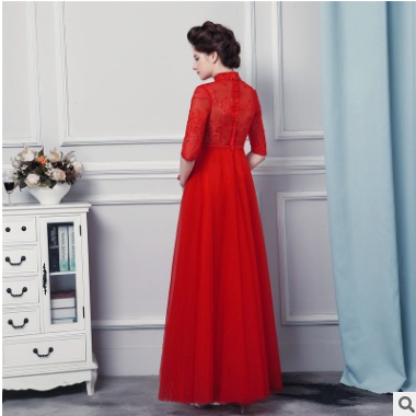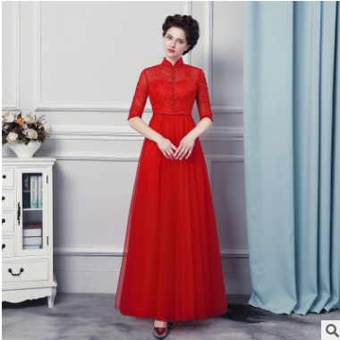 2018年新款長袖中式婚紗禮服蕾絲鑲鉆小立領中式婚紗禮服