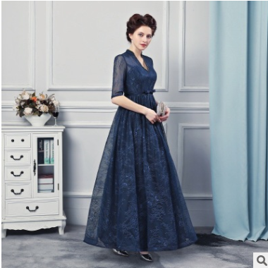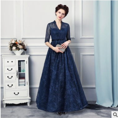 薄紗V領中袖蓬蓬裙長禮服刺繡伴娘服婚慶禮儀主持禮服