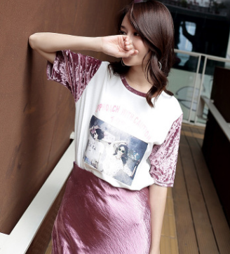 全棉女士金絲絨拼接T恤短袖夏 森女系潮流人物圓領(lǐng)女裝上衣批發(fā)