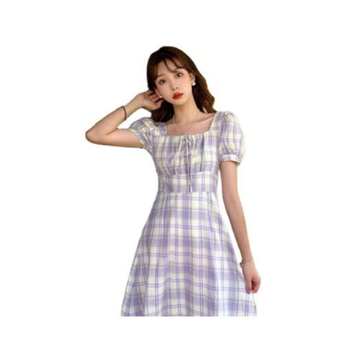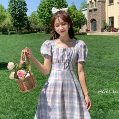 夏裝2021年新款蝴蝶結系帶方領格子泡泡袖連衣裙女氣質收腰A字裙