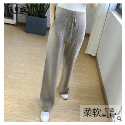 羊毛2021春季女裝新韓版針織闊腿褲休閑寬松羊毛長褲松緊高腰褲子