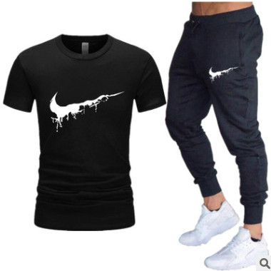 速賣通短袖t恤圓領2019新款 字母印花潮牌短袖T恤+長褲套裝
