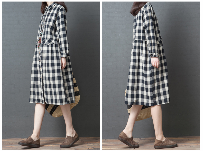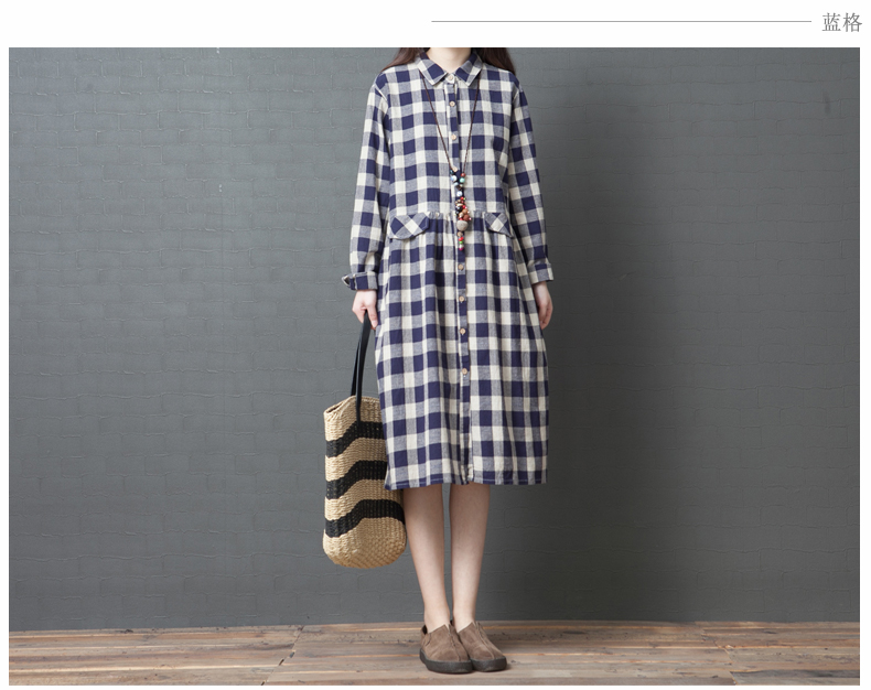 外貿(mào)春裝新款2019韓版寬松大碼女裝時尚格子棉麻襯衫裙 女