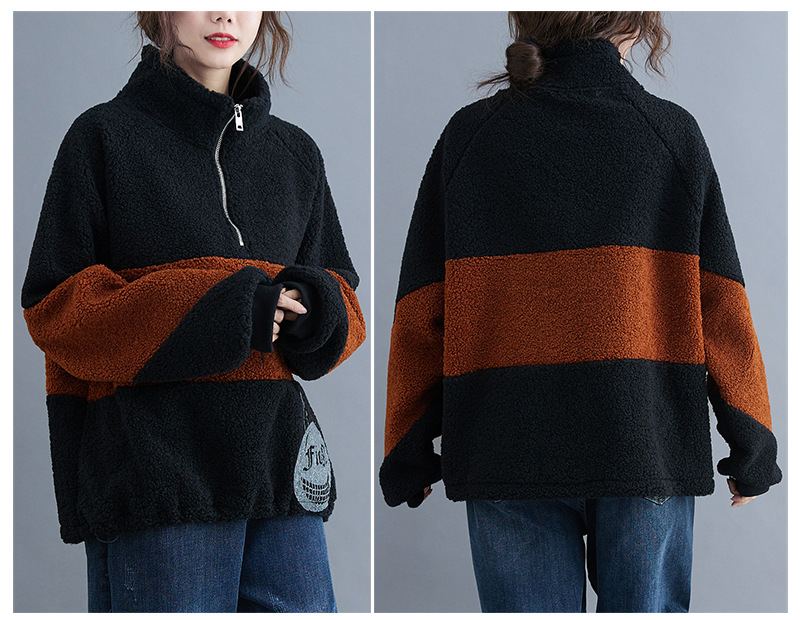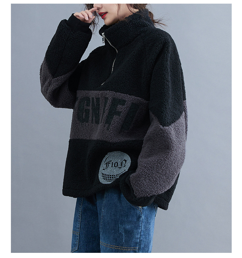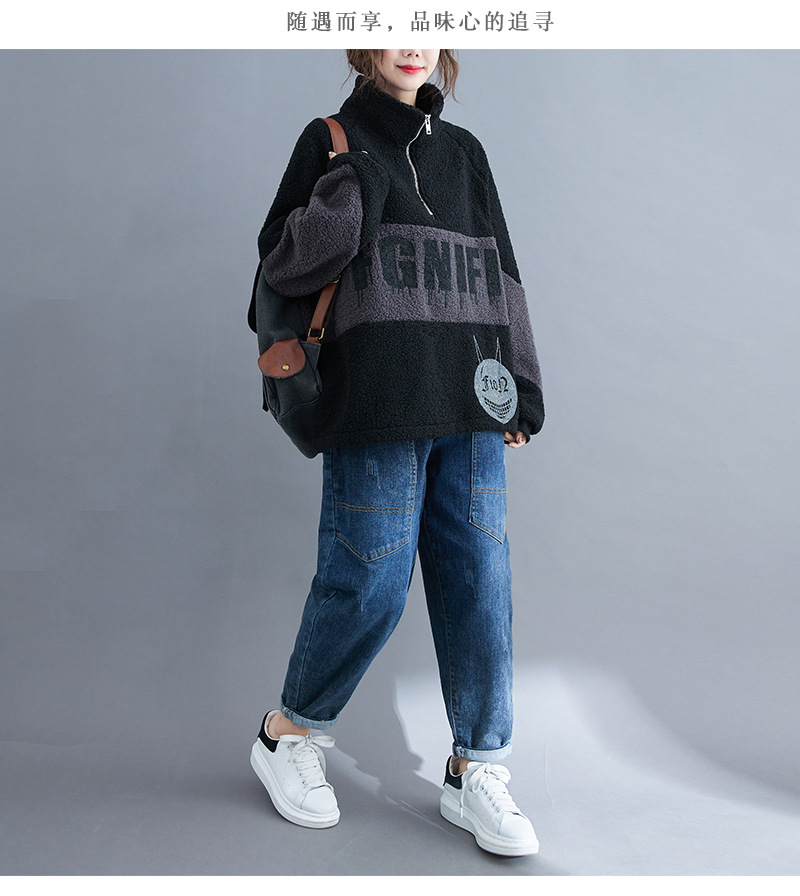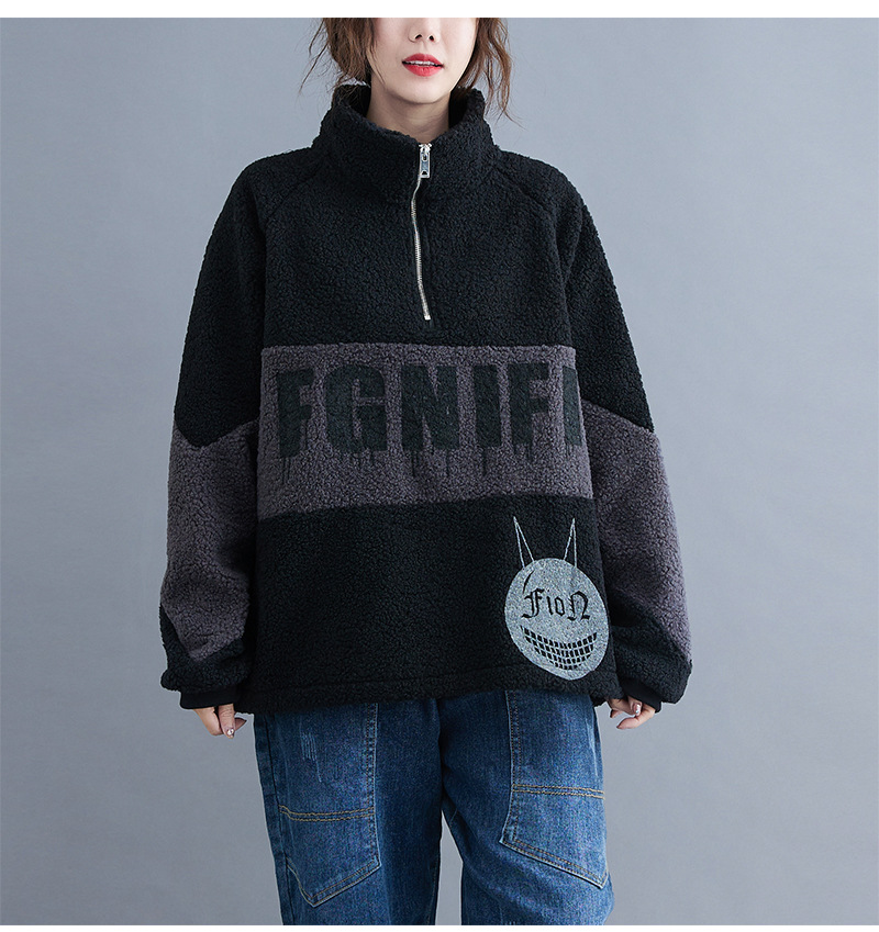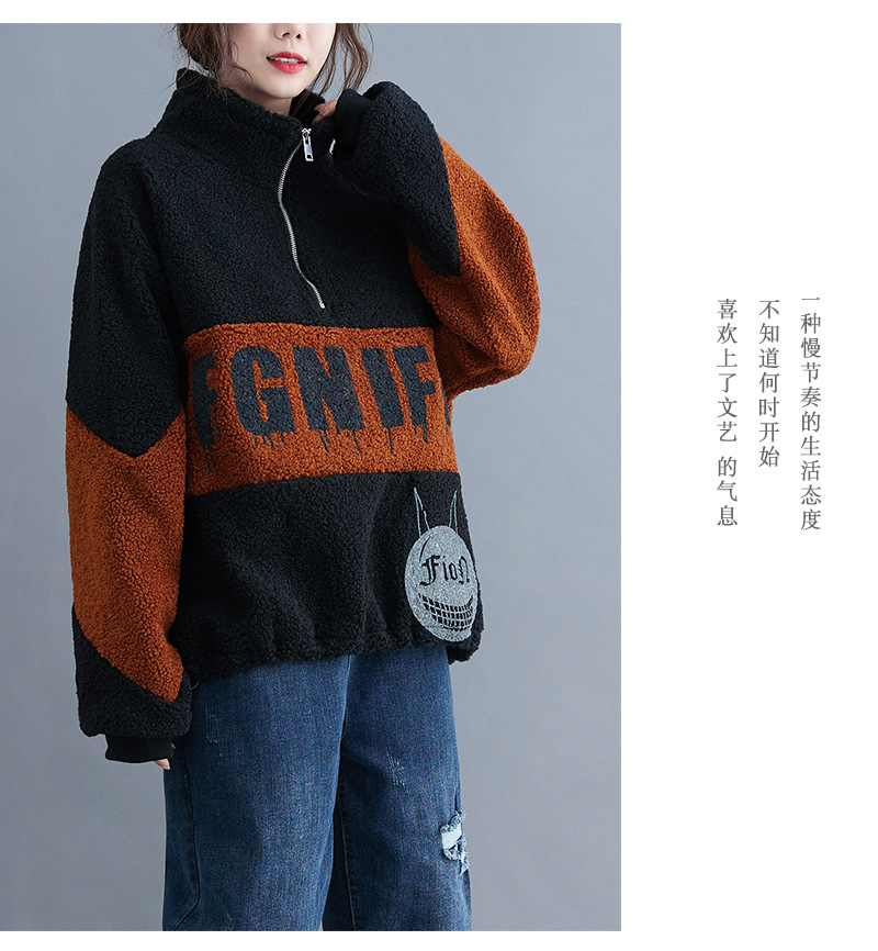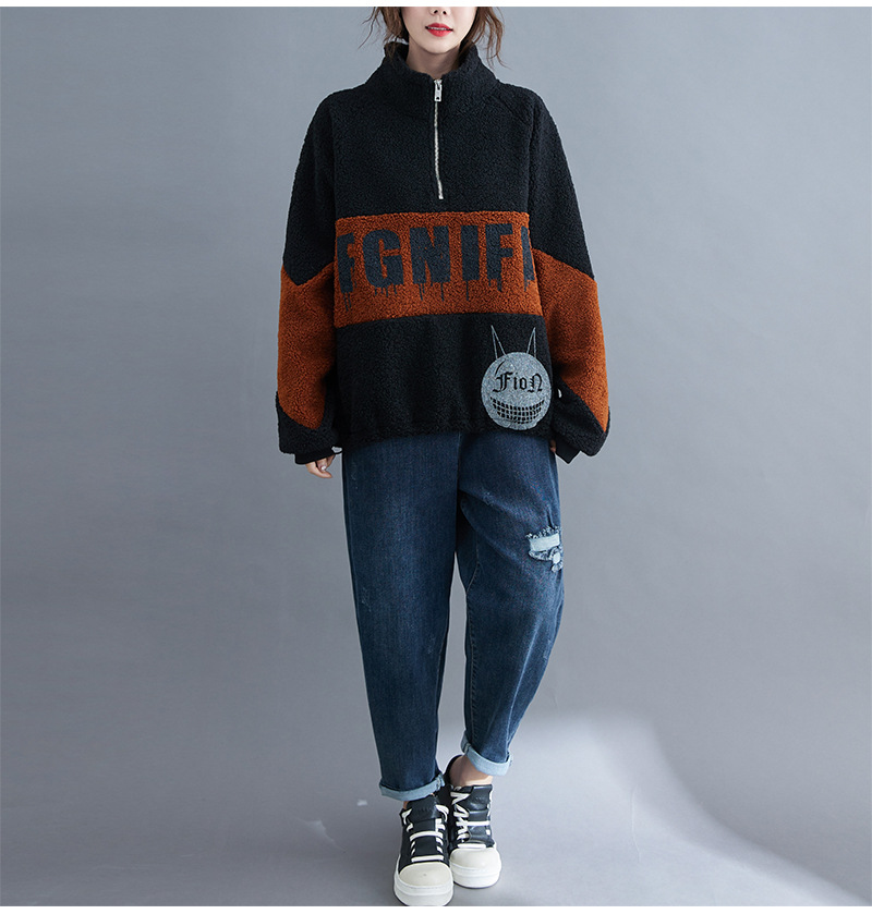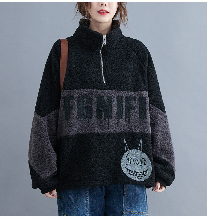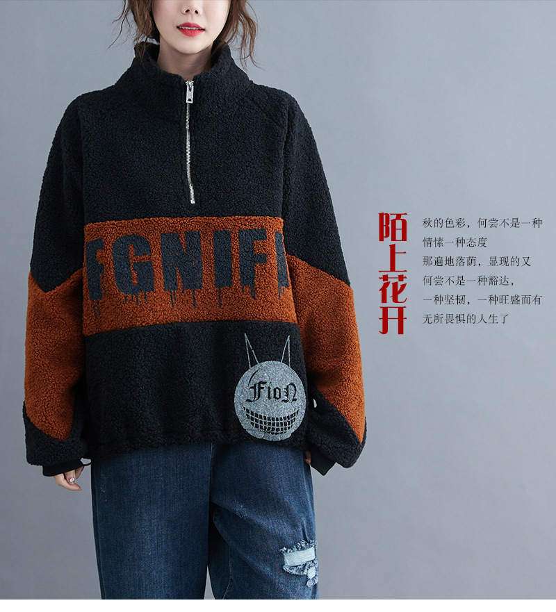冬裝2020新款女韓版時尚寬松大碼文藝笑臉印花羊羔毛加絨衛(wèi)衣上衣
