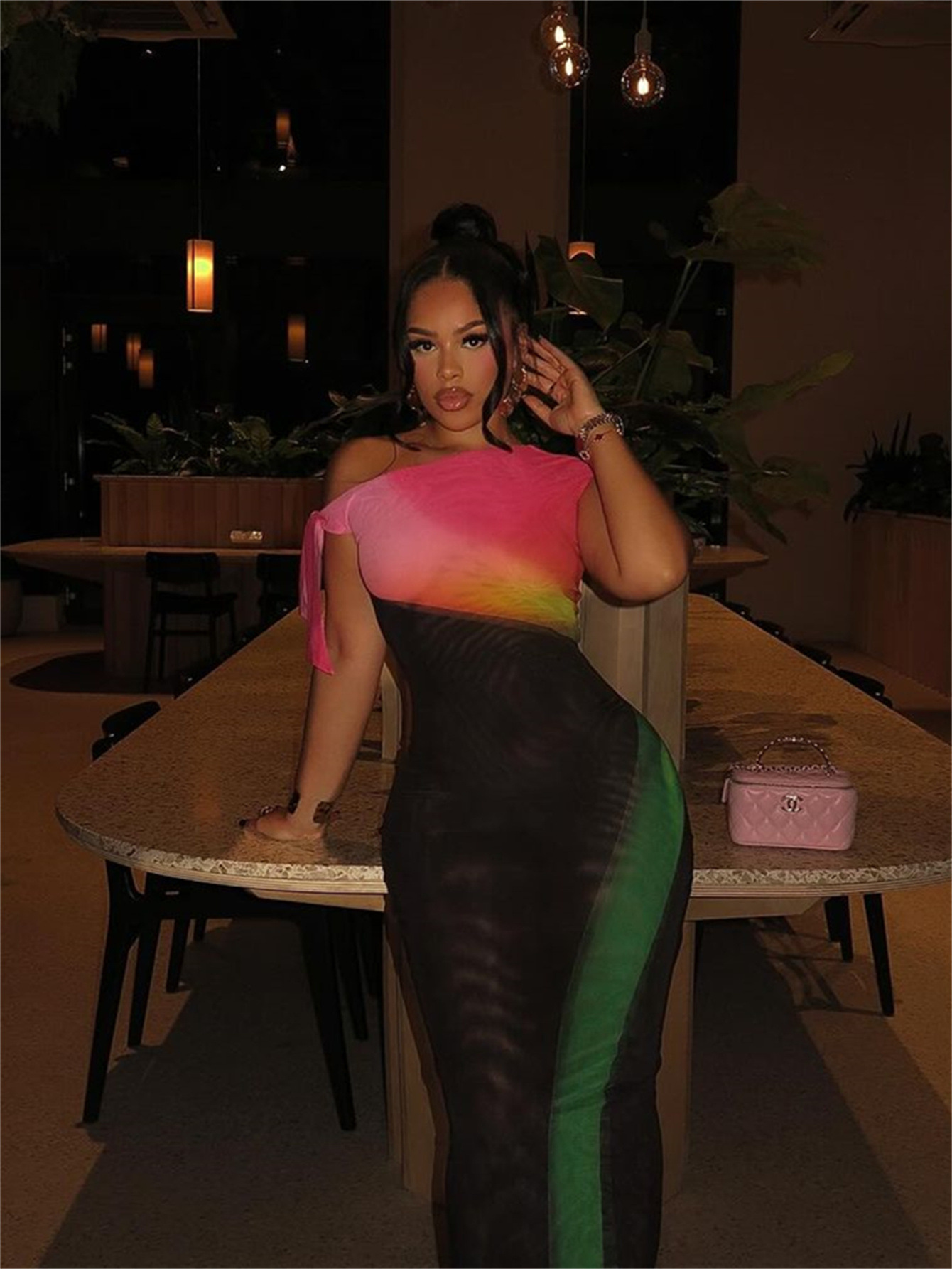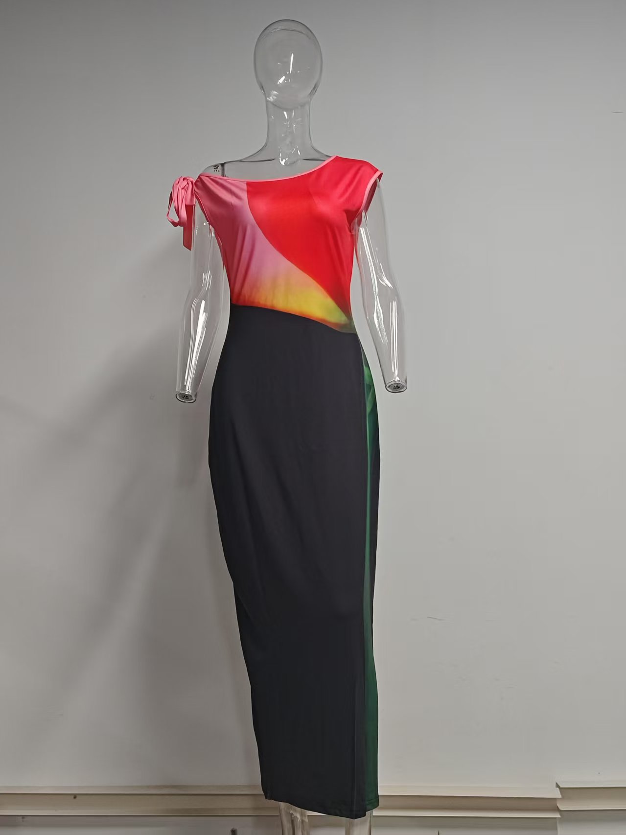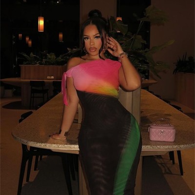 秋季新款跨境歐美時尚百搭彈力撞色修身性感斜領長裙包臀連衣裙女