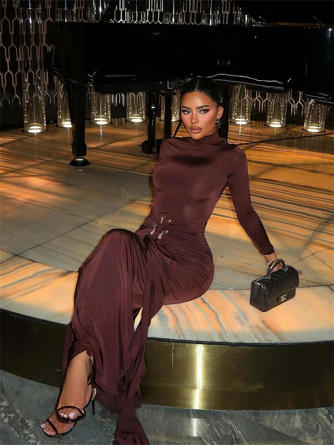 歐美新款跨境時尚氣質優雅金屬設計純色修身性感包臀長裙連衣裙女