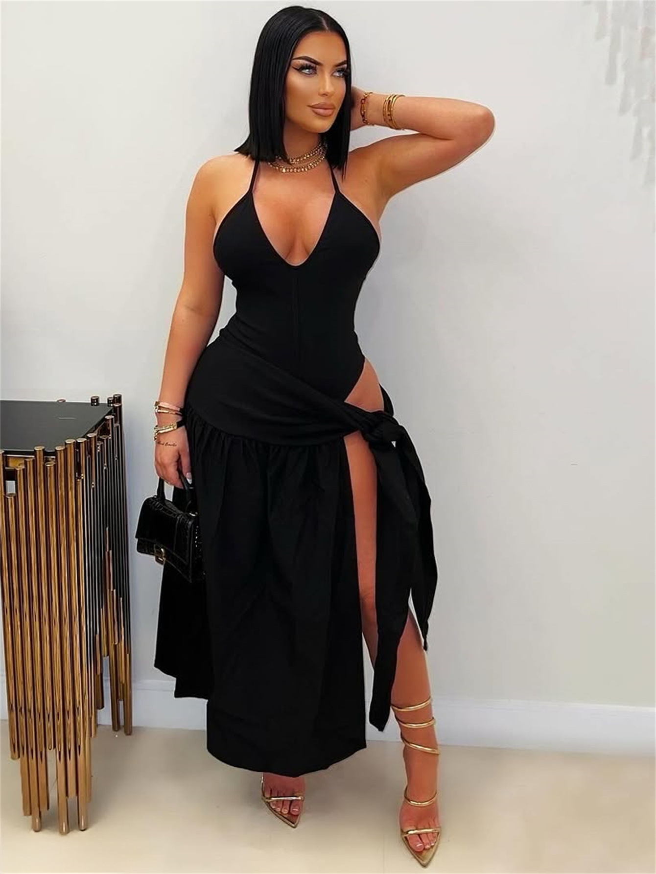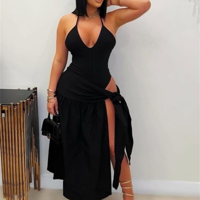 歐美新款跨境時尚純色修身性感深V綁帶露背開叉長裙吊帶連衣裙女