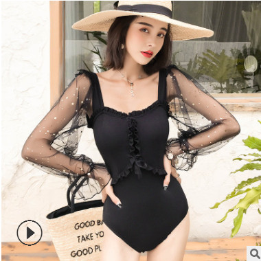 泳衣女遮肚顯瘦性感仙女范透氣網紗防曬長袖絲絨新款溫泉連體泳衣 一件代發