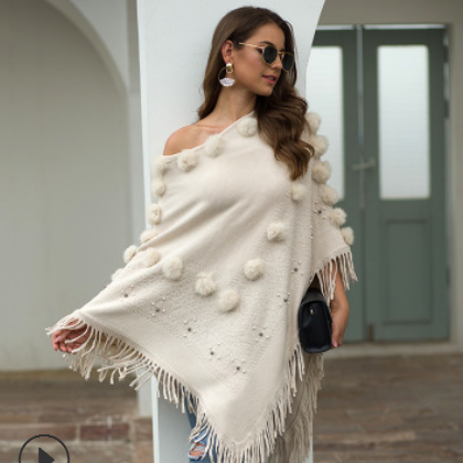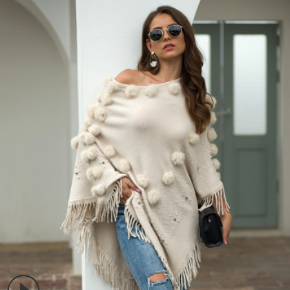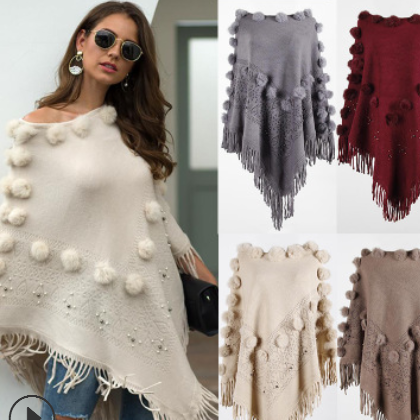 2020秋冬新款歐美女裝外貿(mào)亞馬遜披肩流蘇斗篷毛球釘珠圓領(lǐng)毛衣女